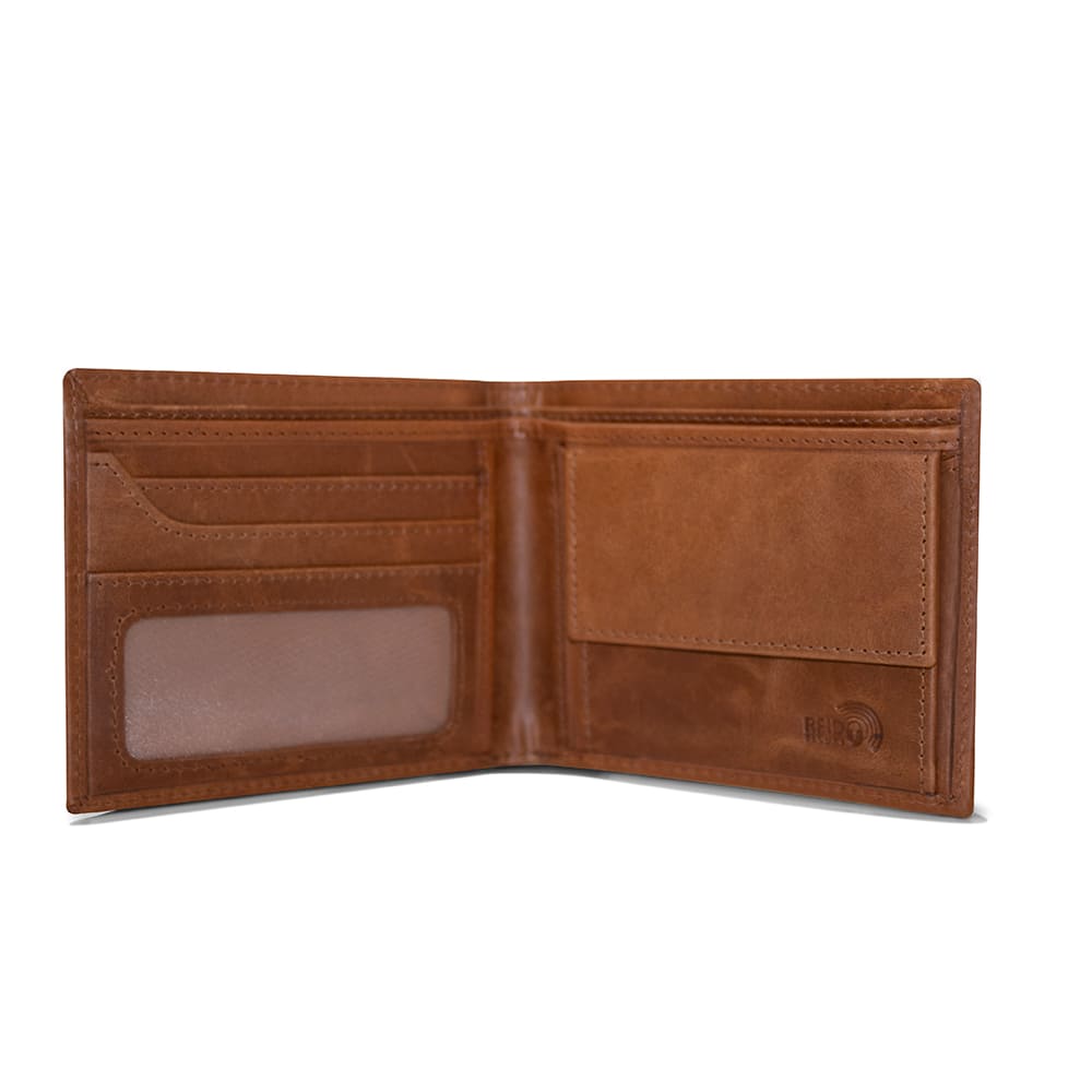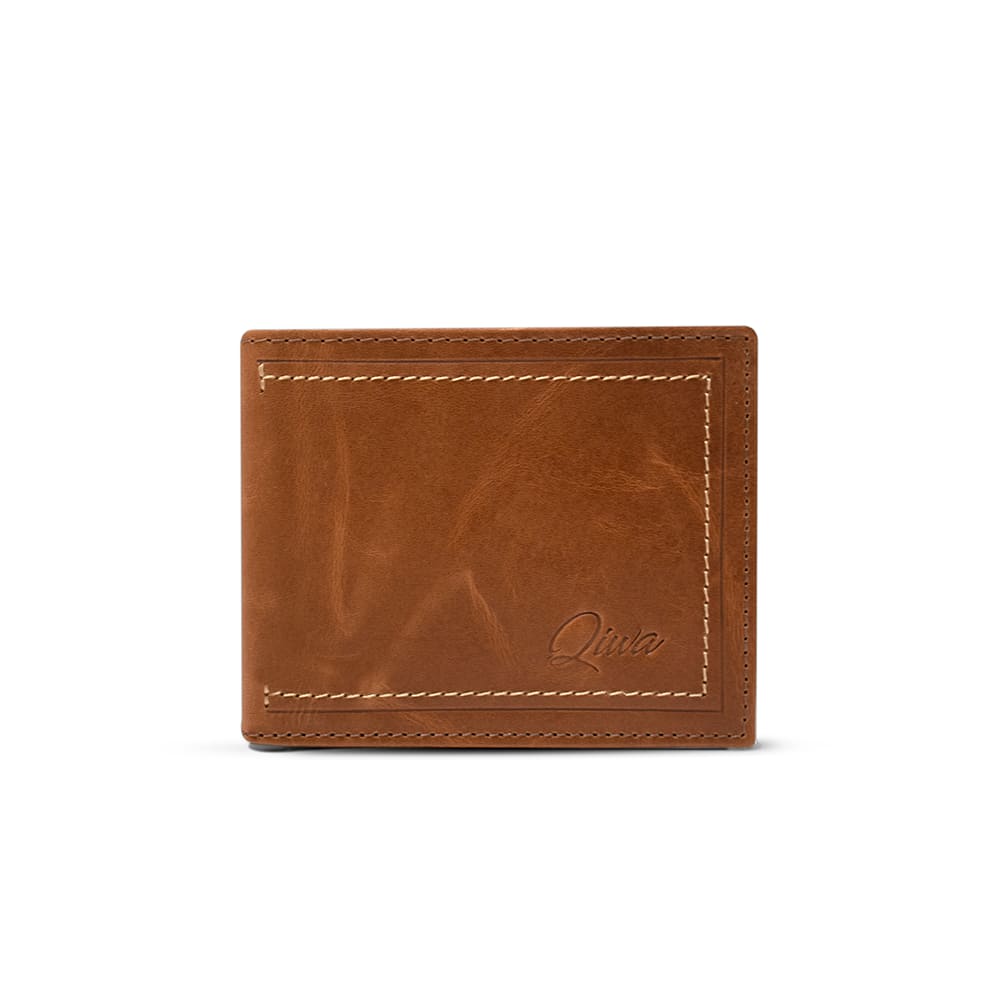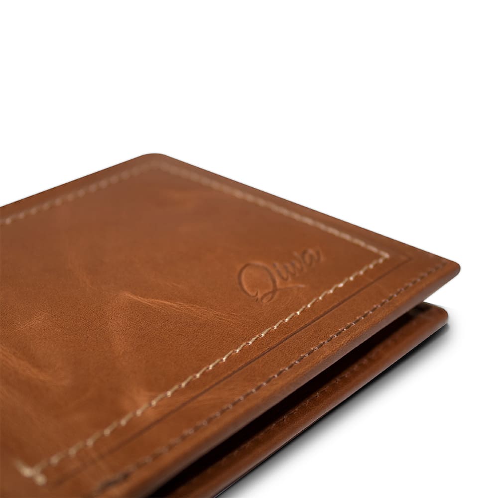 Billetera de cuero genuino en tono café claro, diseñada con múltiples ranuras para tarjetas, ventana para identificación y un práctico compartimento para monedas. Su estilo clásico y su protección RFID ofrecen seguridad, organización y durabilidad en un accesorio moderno y sofisticado.