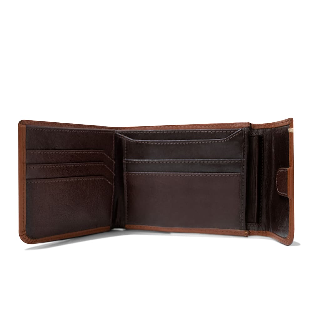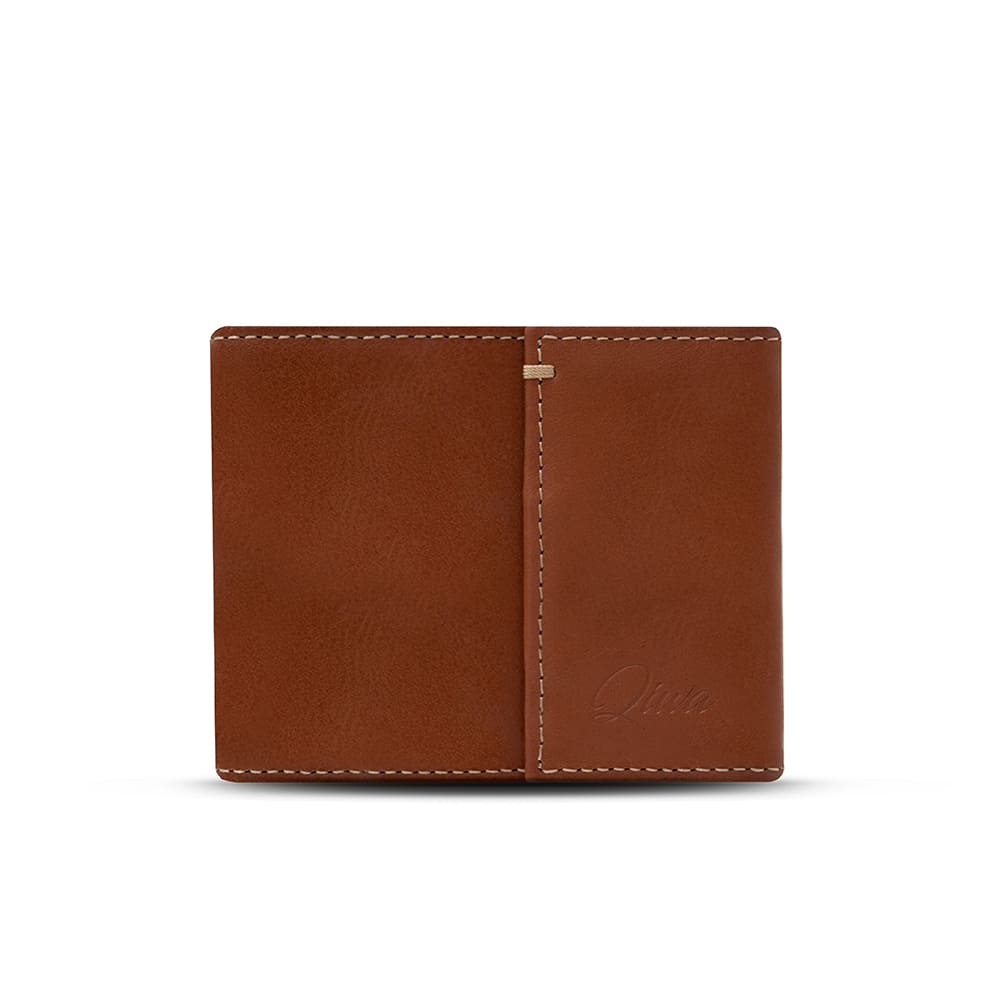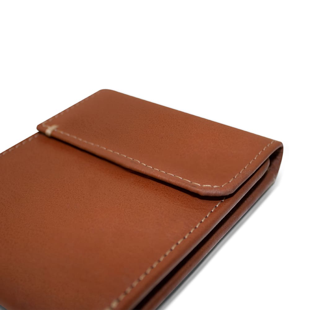 Billetera de cuero genuino en tono café claro, con un diseño moderno que combina costuras visibles y un detalle frontal minimalista. Su interior ofrece múltiples ranuras para tarjetas, compartimentos adicionales y un práctico espacio para billetes, brindando organización y funcionalidad. Fabricada con materiales duraderos y un estilo sofisticado, es el accesorio ideal para quienes buscan elegancia y practicidad en su día a día.